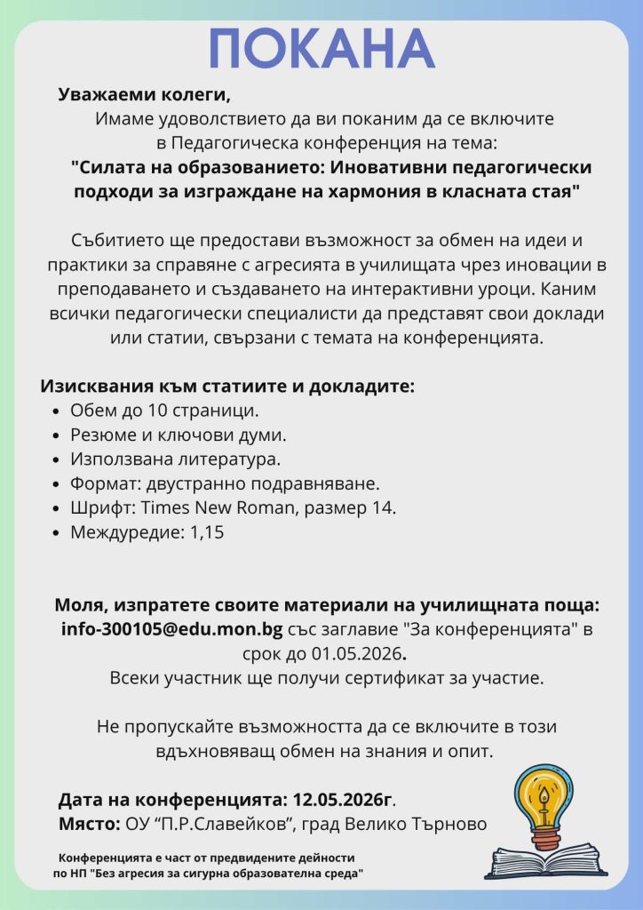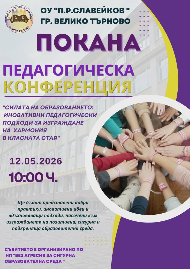 Каним педагогически специалисти от училищата в областта да се включат в Педагогическа конференция на тема „Силата на образованието: Иновативни педагогически подходи за изграждане на хармония в класната стая“, която ще бъде организирана на 12 май 2026 г. от ръководството и педагогическите специалисти на Основно училище „П. Р. Славейков“, гр. Велико Търново.